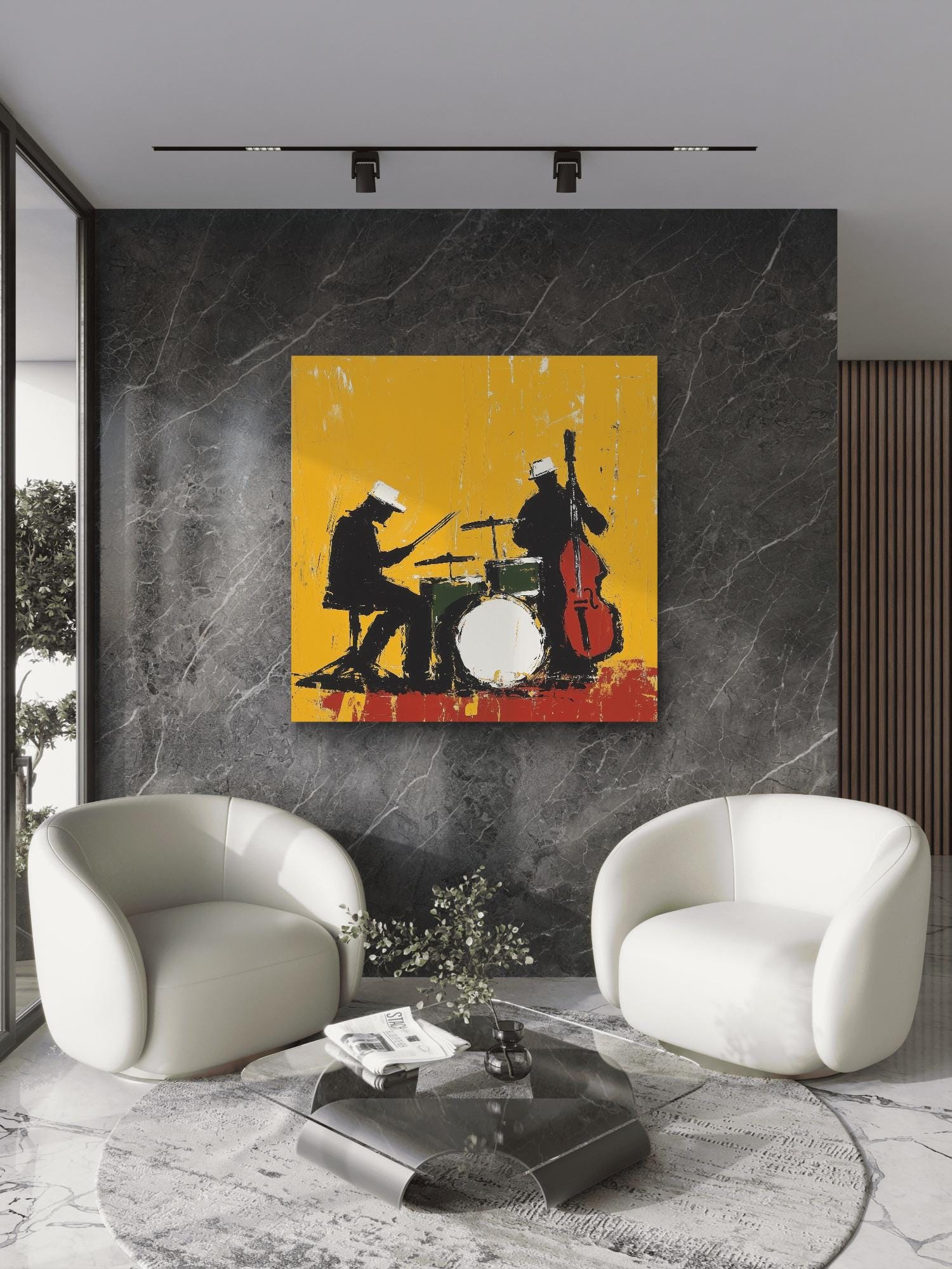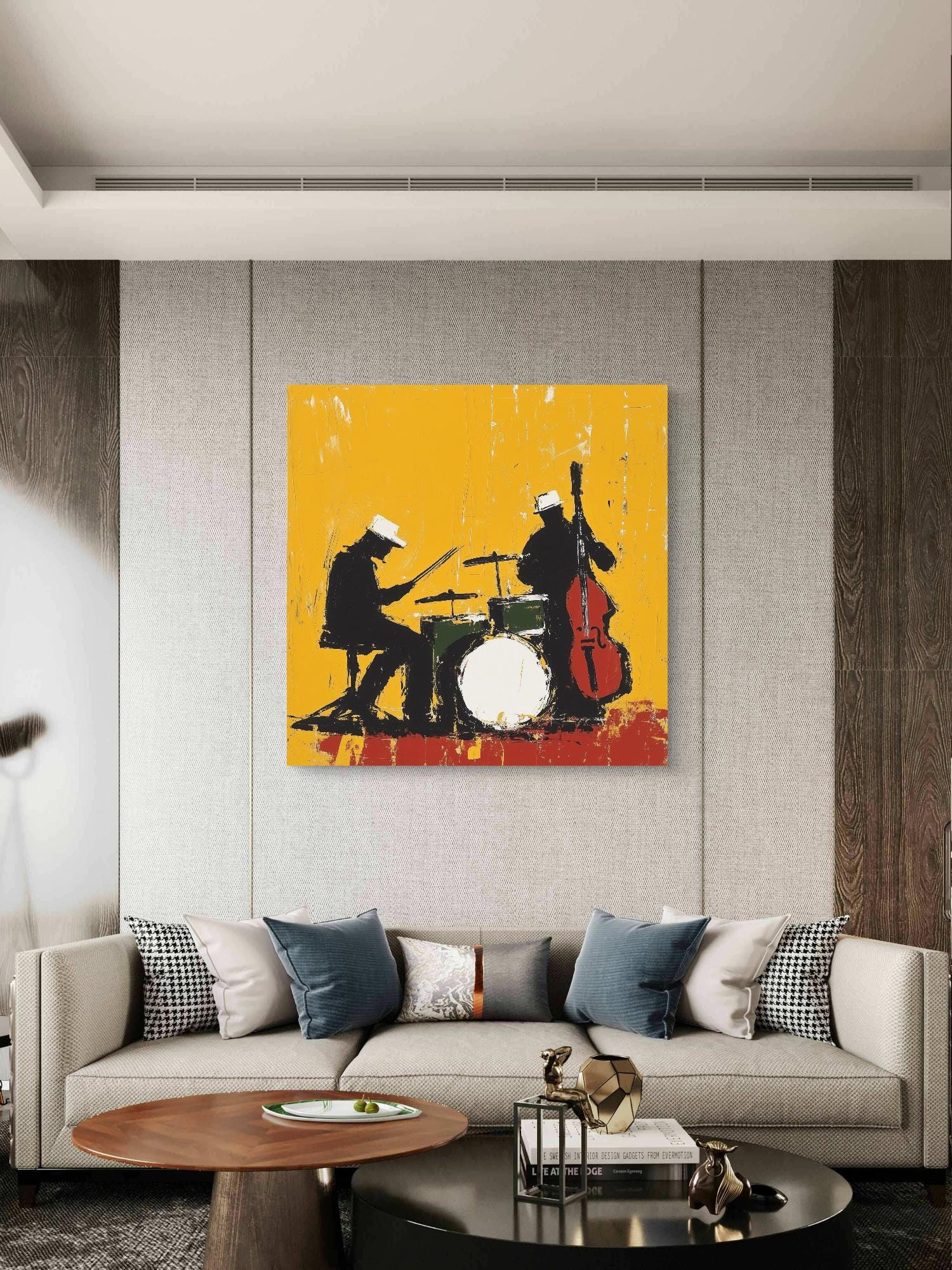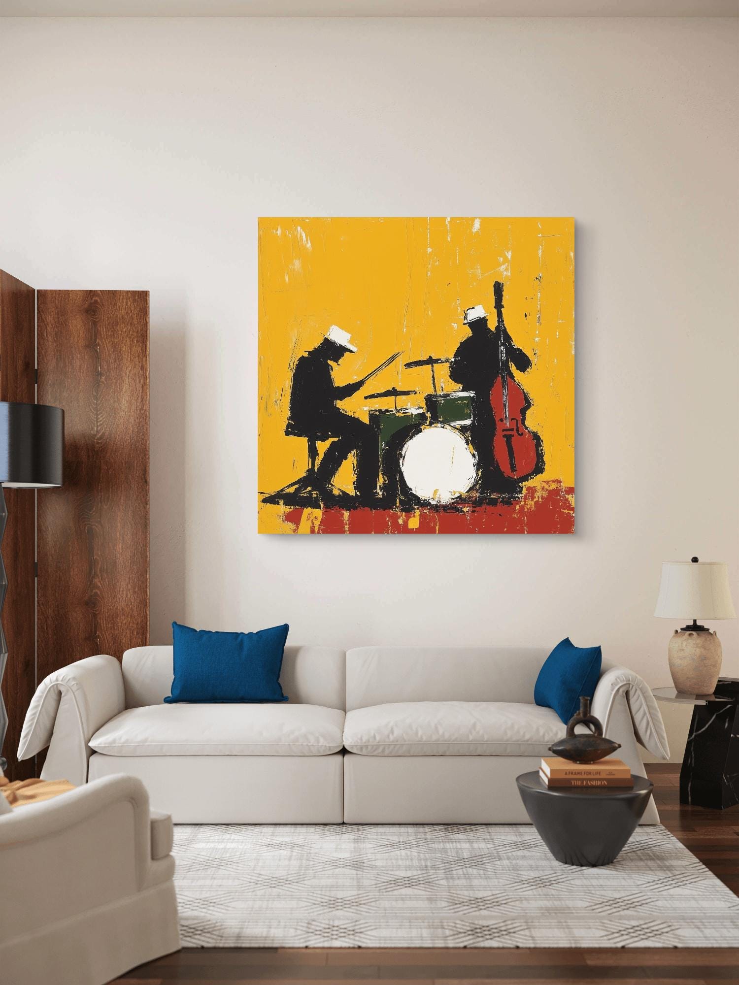 Bring your walls to life with Midnight Rehearsal, a bold and expressive jazz-themed artwork capturing the rhythm and soul of a live performance. This abstract silhouette features a drummer and upright bassist, contrasted against a vivid yellow backdrop that radiates energy and movement. Available as a premium canvas or archival paper print, it’s perfect for music lovers, creatives, and modern art collectors looking to make a statement.