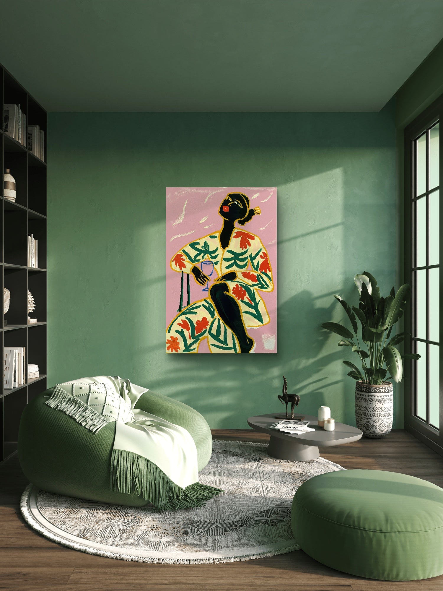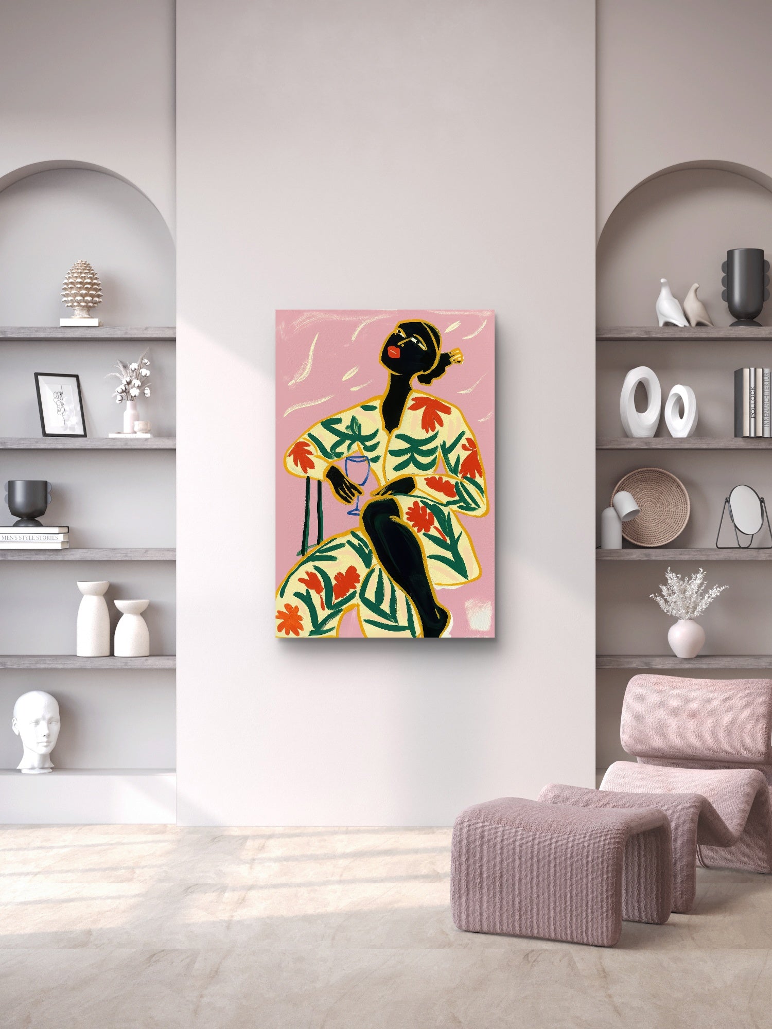 Afrocentric wall art featuring a bold woman in a floral outfit with vibrant colors on a pink background, available as a premium ready-to-hang canvas print.