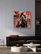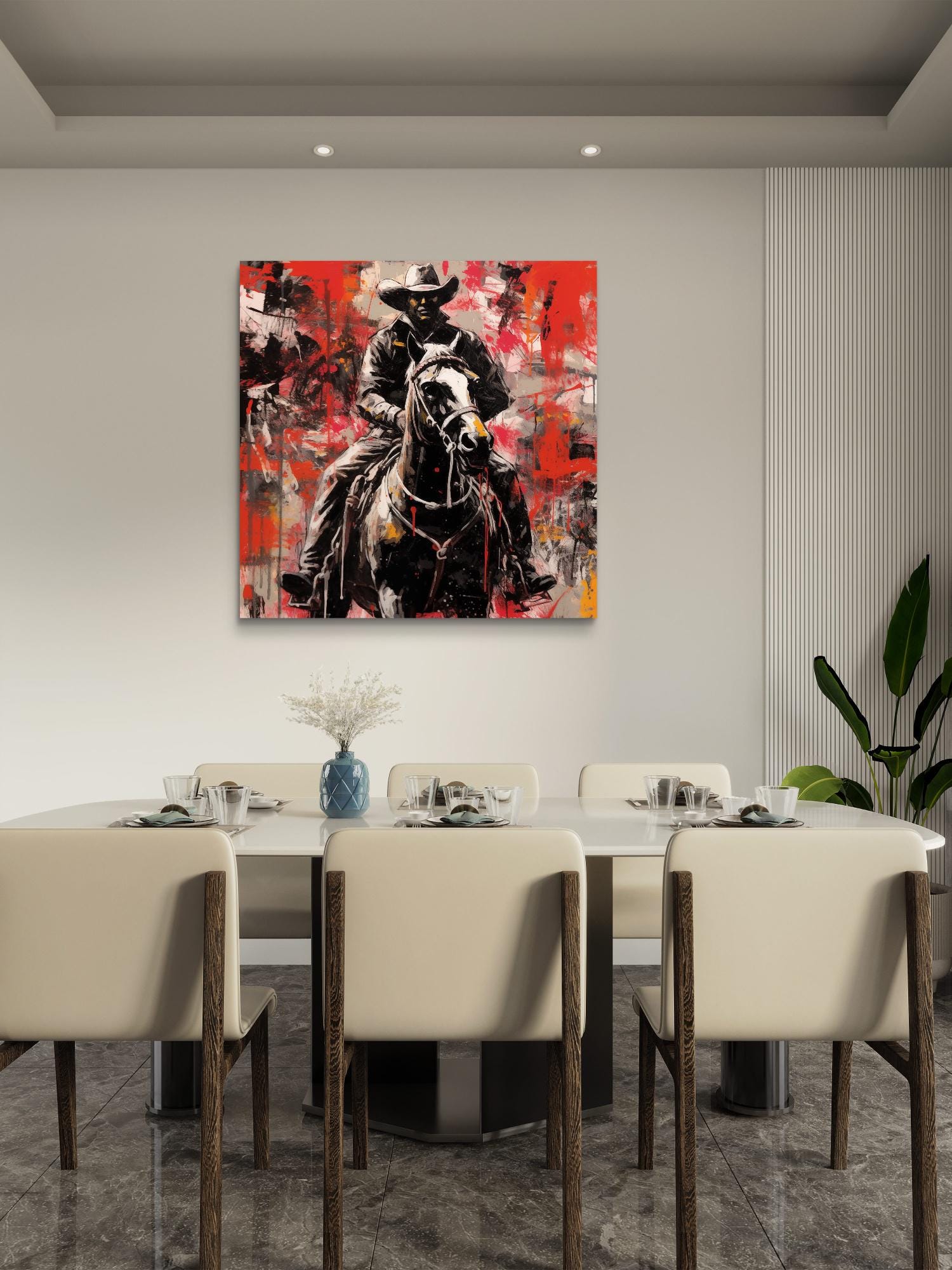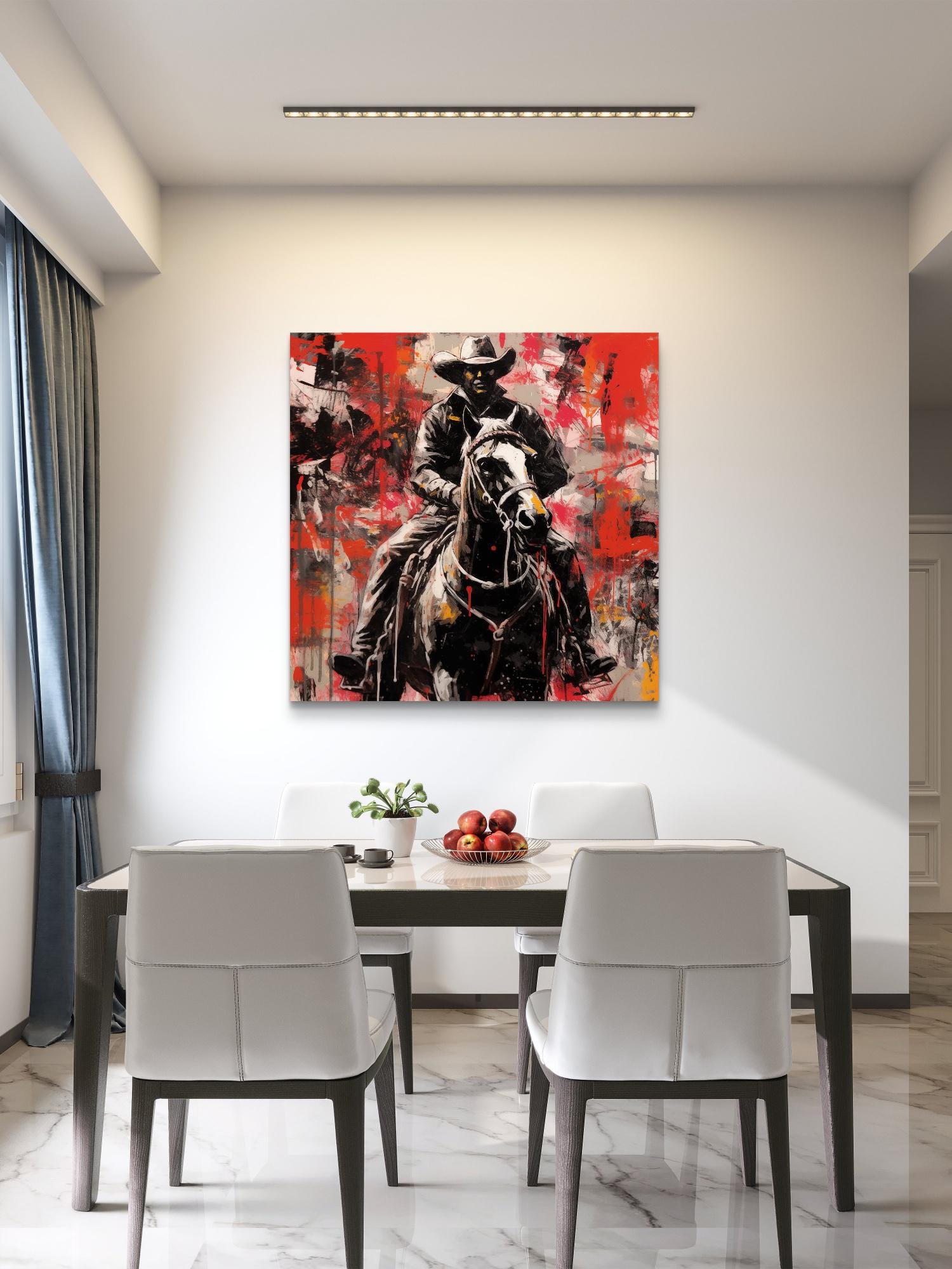 Western Grit” reimagines the iconic cowboy through a modern, expressive lens. With bold brushstrokes, splattered reds, and gritty textures, this artwork captures the strength, mystery, and solitude of a lone rider on horseback. The fusion of classic Western imagery and contemporary abstract technique makes this piece a standout for rustic spaces, masculine decor, or edgy urban interiors.