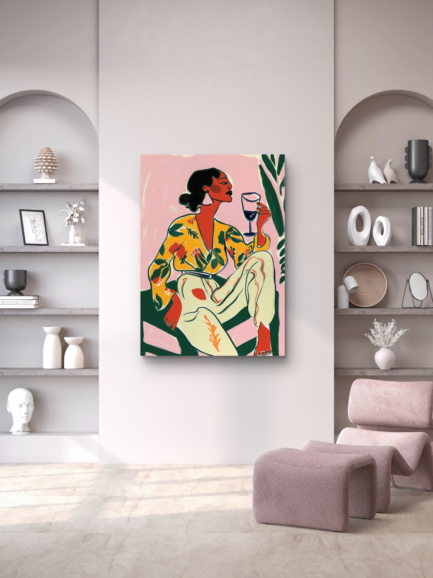 This dynamic artwork features a bold Afrocentric woman enjoying a glass of wine, surrounded by vibrant colors and abstract patterns. The playful mix of pinks, yellows, and greens creates an uplifting and stylish statement for any space. Perfect for living rooms, dining areas, or creative workspaces, this premium canvas print blends elegance and joy in one striking piece.