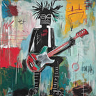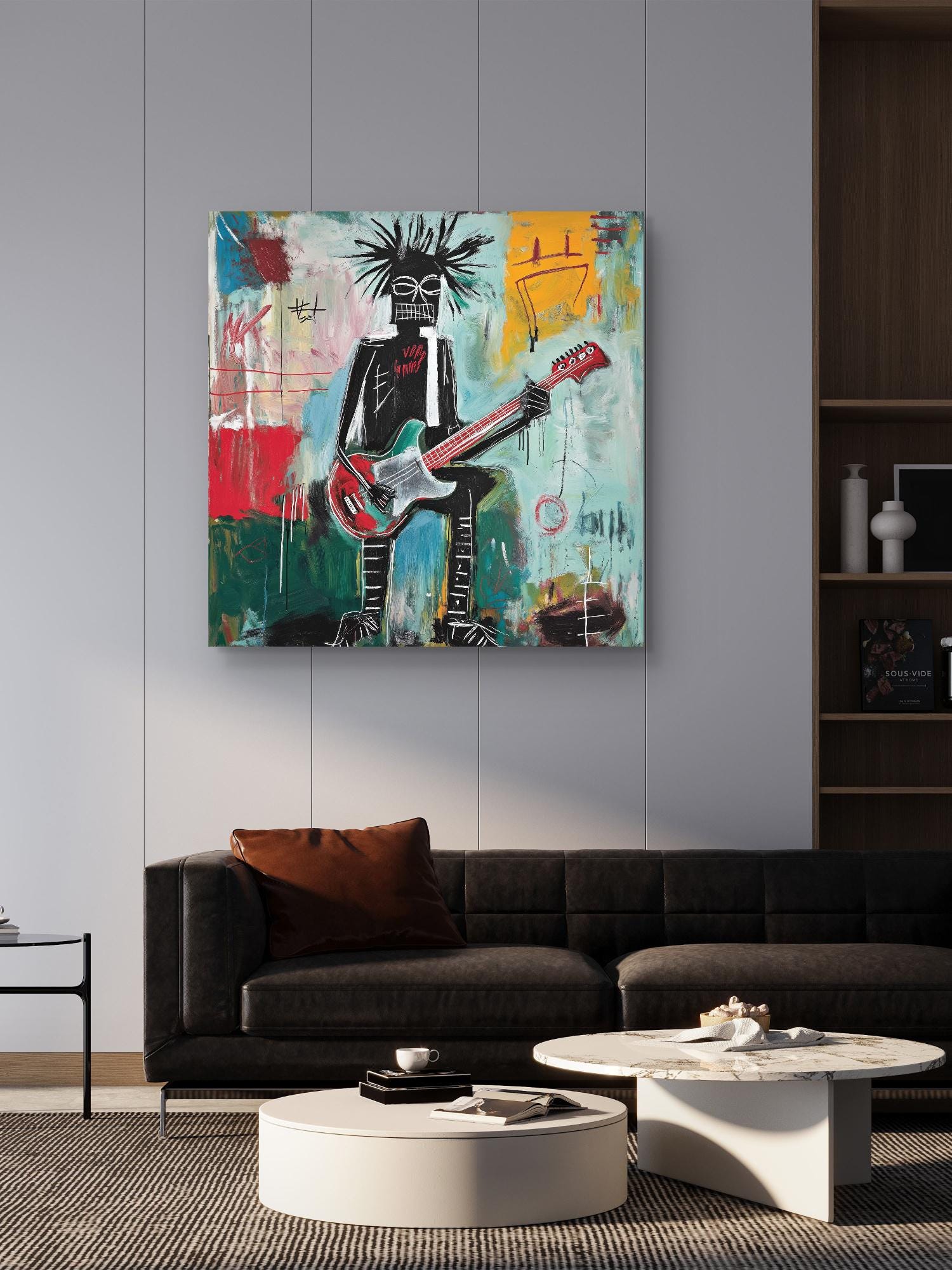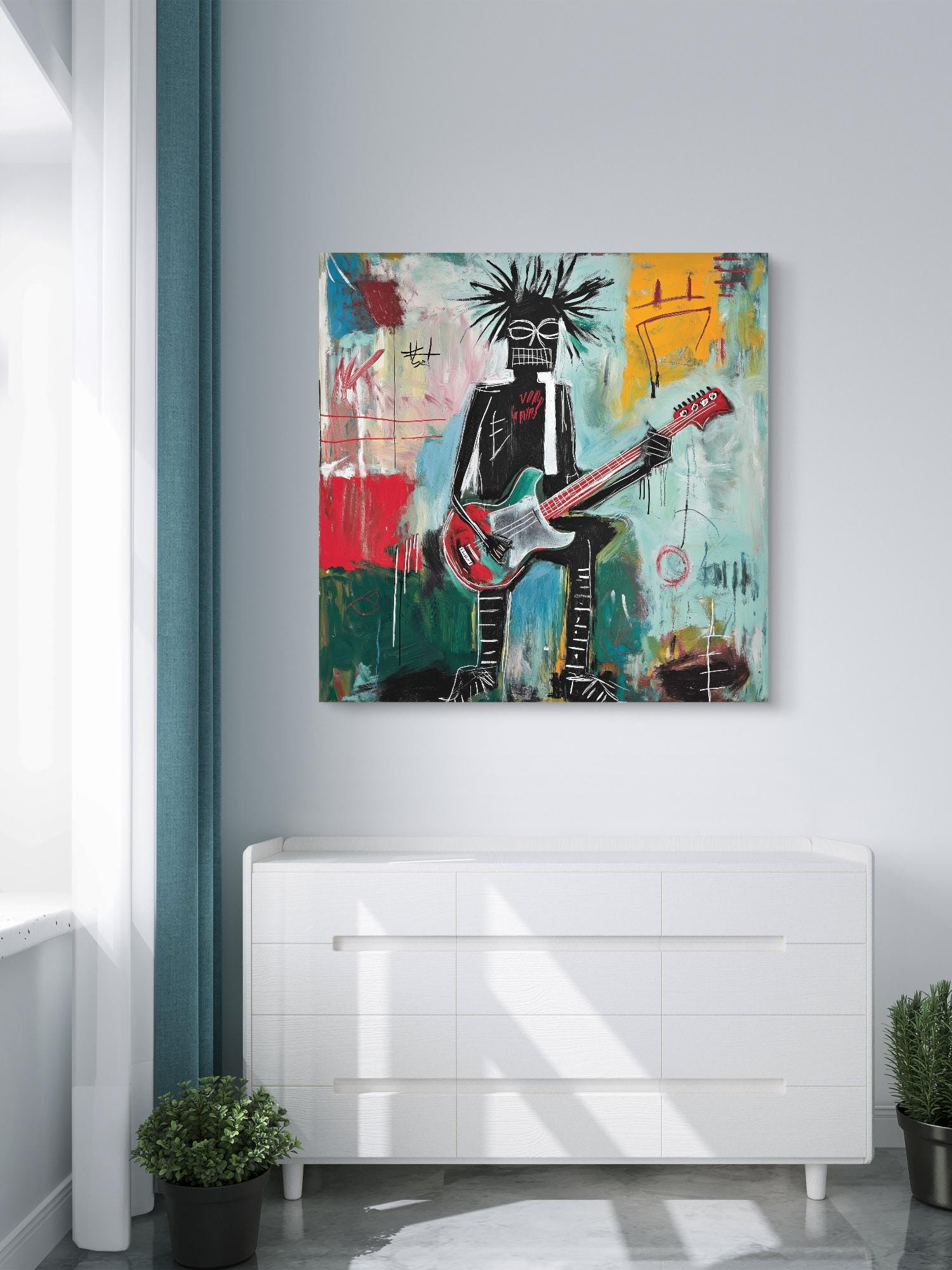 Noise & Color is a chaotic celebration of punk energy and visual rebellion. Featuring a wild-haired guitarist rendered in a graffiti-meets-primitive style, this artwork bursts with raw brushstrokes, vibrant color clashes, and expressive street-art attitude. The electric reds, moody teals, and scratched-out layers evoke a sound you can feel through the canvas.