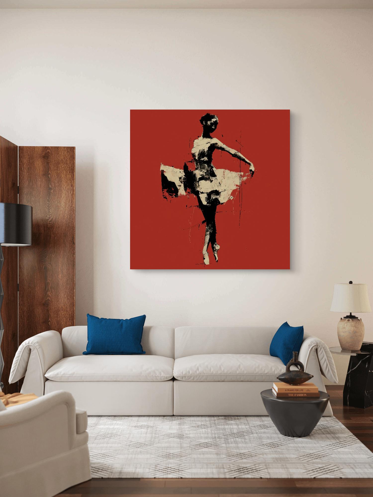 Scarlet Solitude captures the graceful stillness of a ballerina poised against a bold scarlet backdrop. Rendered in expressive brush strokes and elegant minimalism, this piece embodies quiet strength, precision, and emotional depth. Its simple yet dramatic design adds refined energy to modern interiors, studios, or galleries.