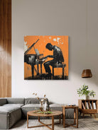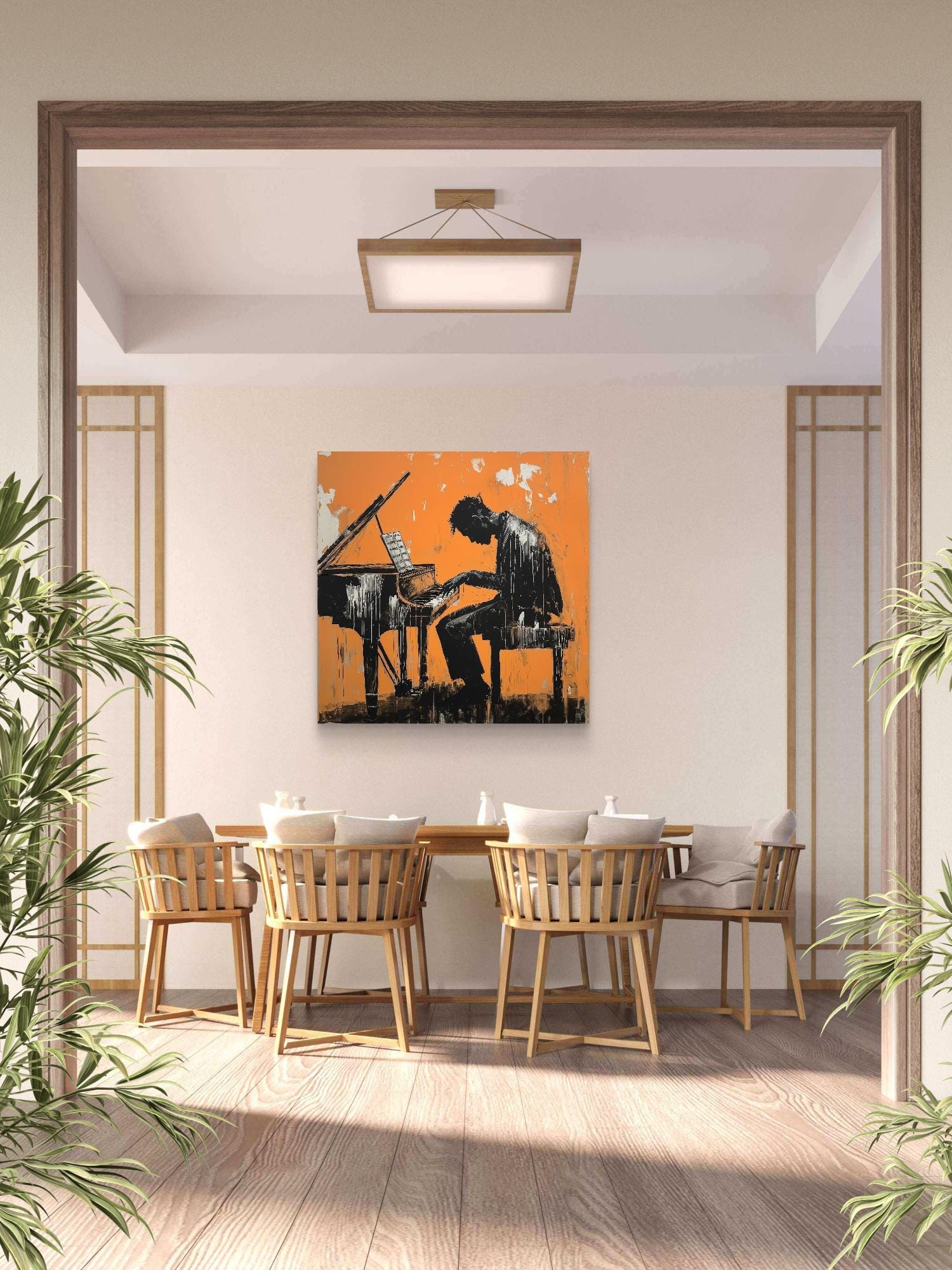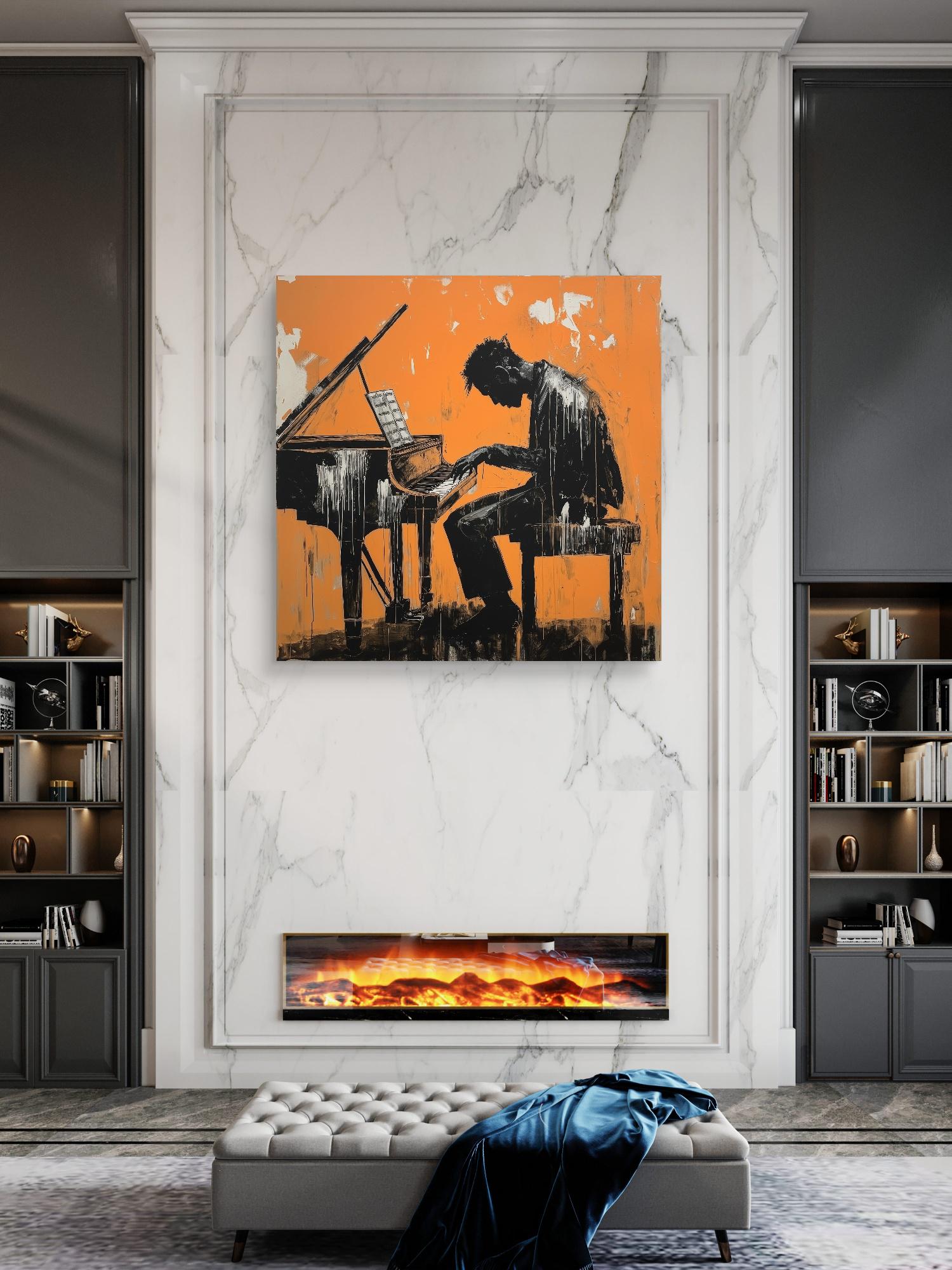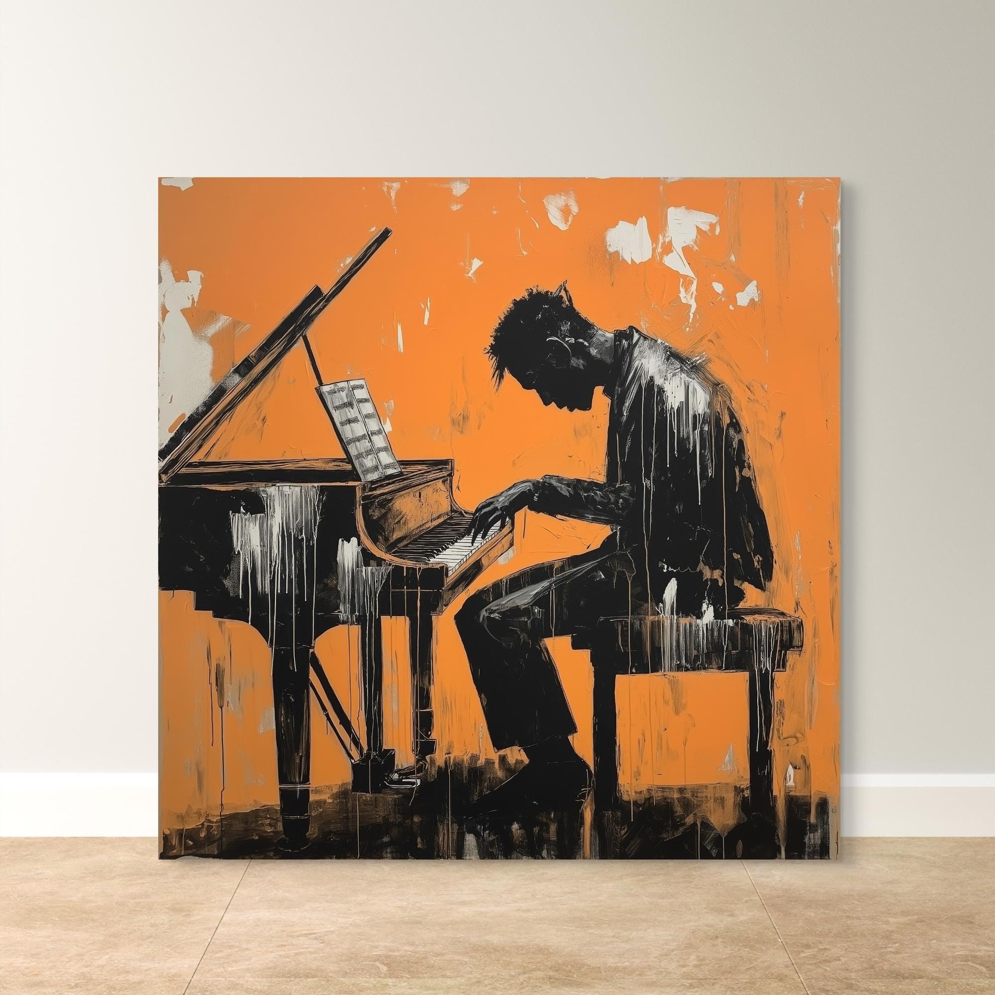 This striking artwork captures the soulful silhouette of a pianist in deep focus, seated at a grand piano with sheet music displayed. The textured black and white figure contrasts powerfully against a rich orange backdrop, creating a bold and emotive scene. Dripping paint adds raw energy, making this piece perfect for music lovers, creatives, and fans of expressive, contemporary art. Available as a canvas or premium paper print.