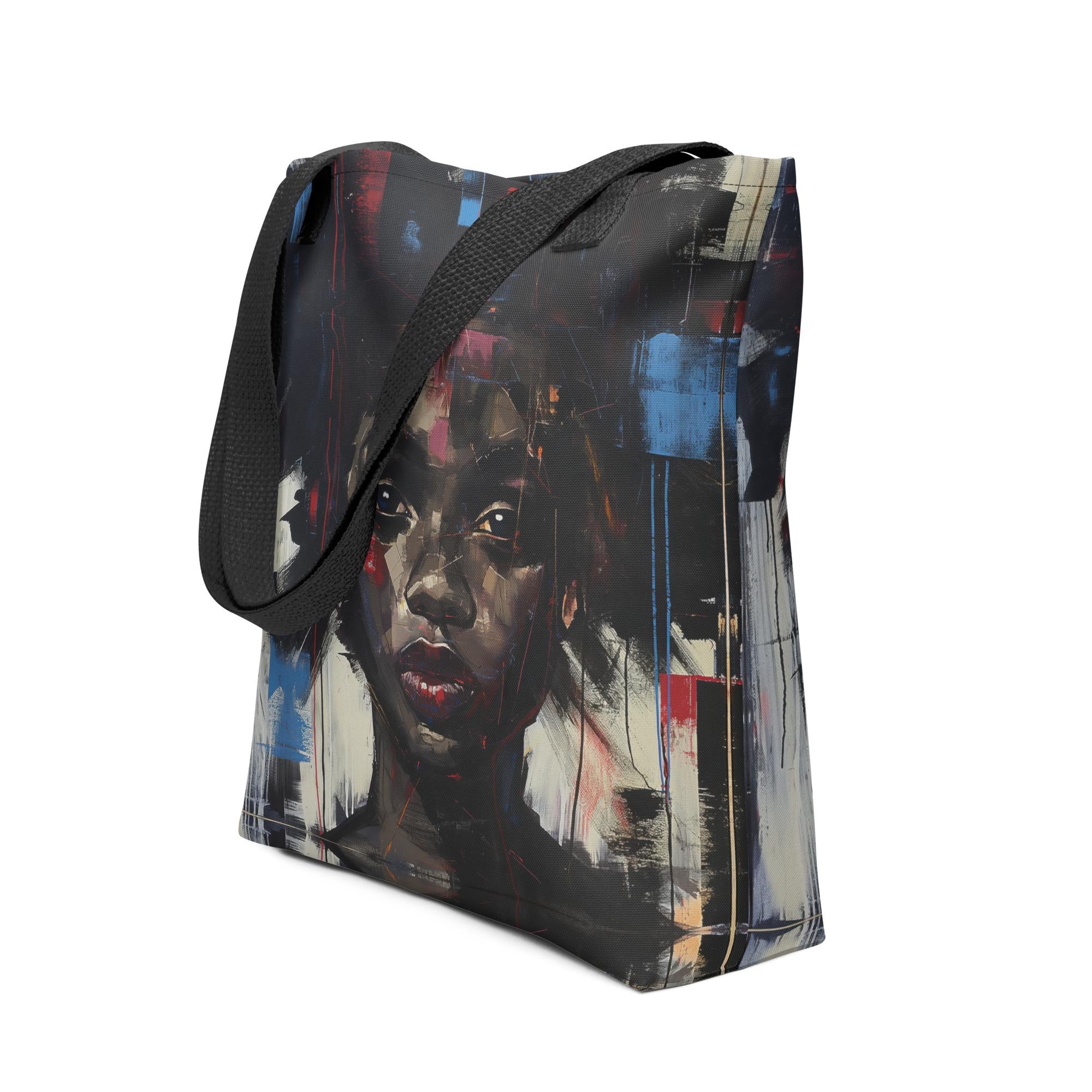 Carry intensity with you. The Midnight Frame tote bag features a striking portrait layered in deep blacks, electric blues, and crimson tones—capturing raw emotion and artistic edge in a single, wearable form. With its bold brushwork and captivating stare, this tote turns heads and makes a statement everywhere you go.