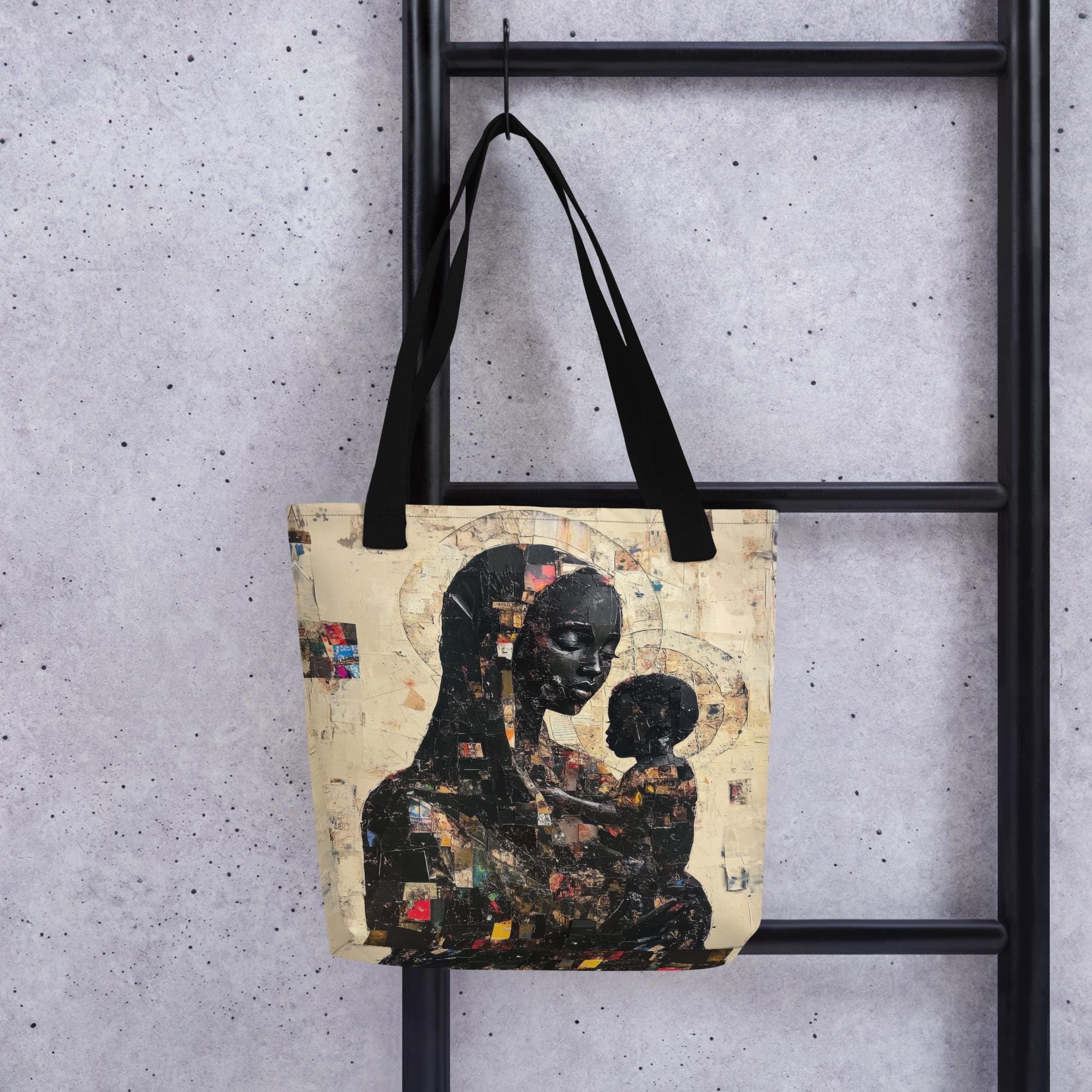Carry strength and tenderness with you wherever you go. This eye-catching tote bag features a powerful digital collage of a Black mother and child, radiating warmth, protection, and divine connection. With halo elements and rich textured tones, this artwork turns your everyday tote into a wearable piece of soulful art.