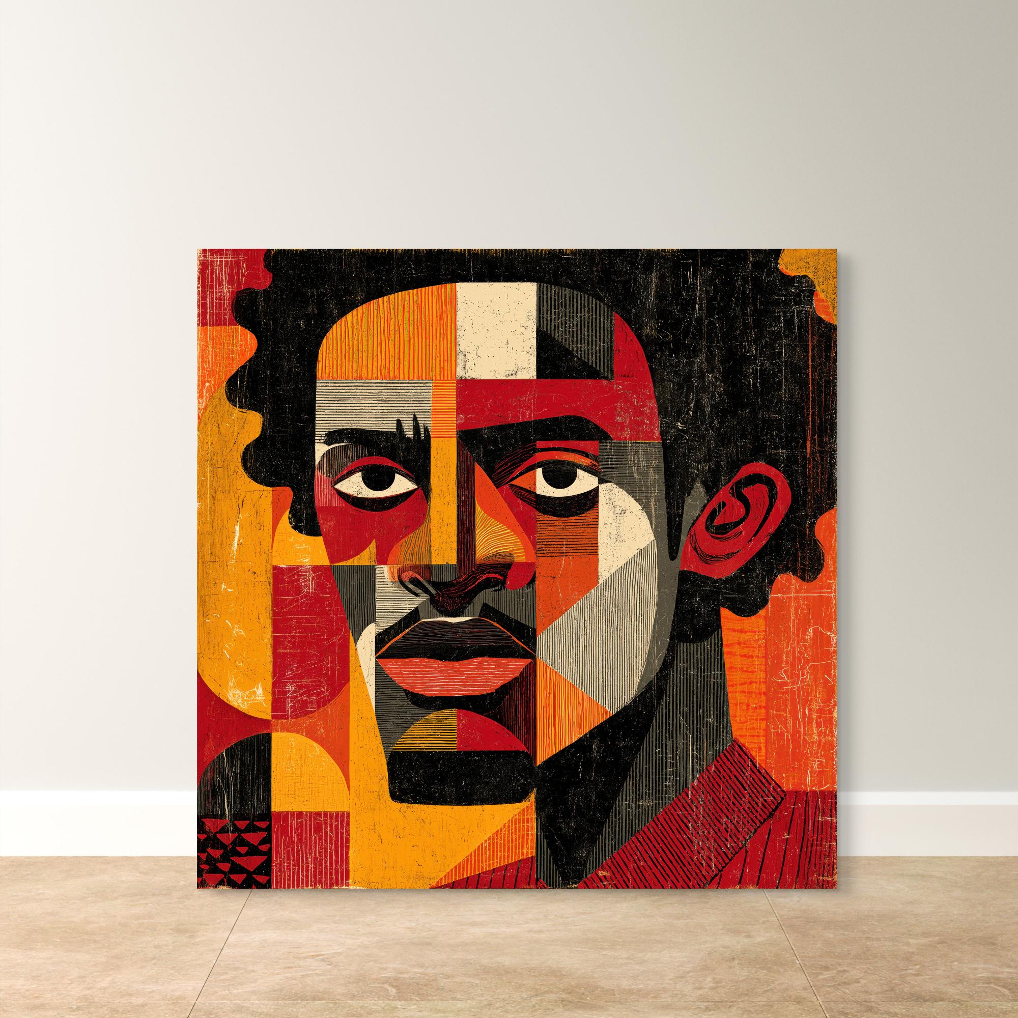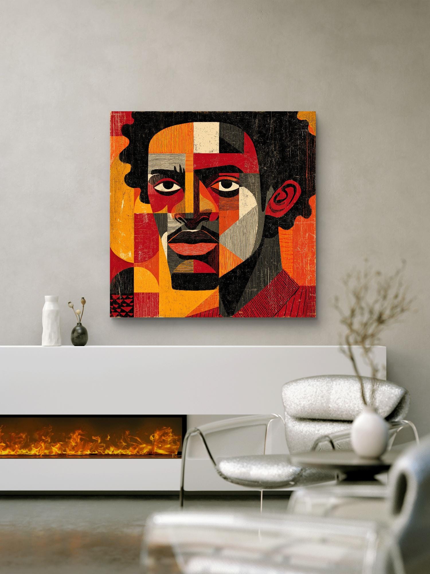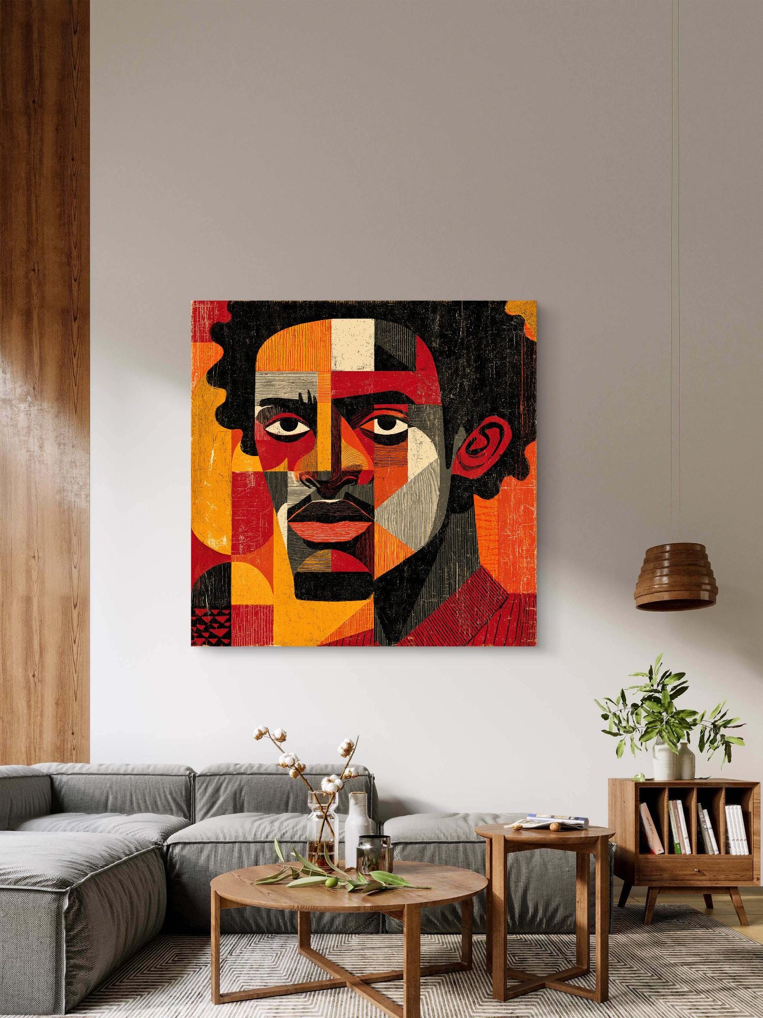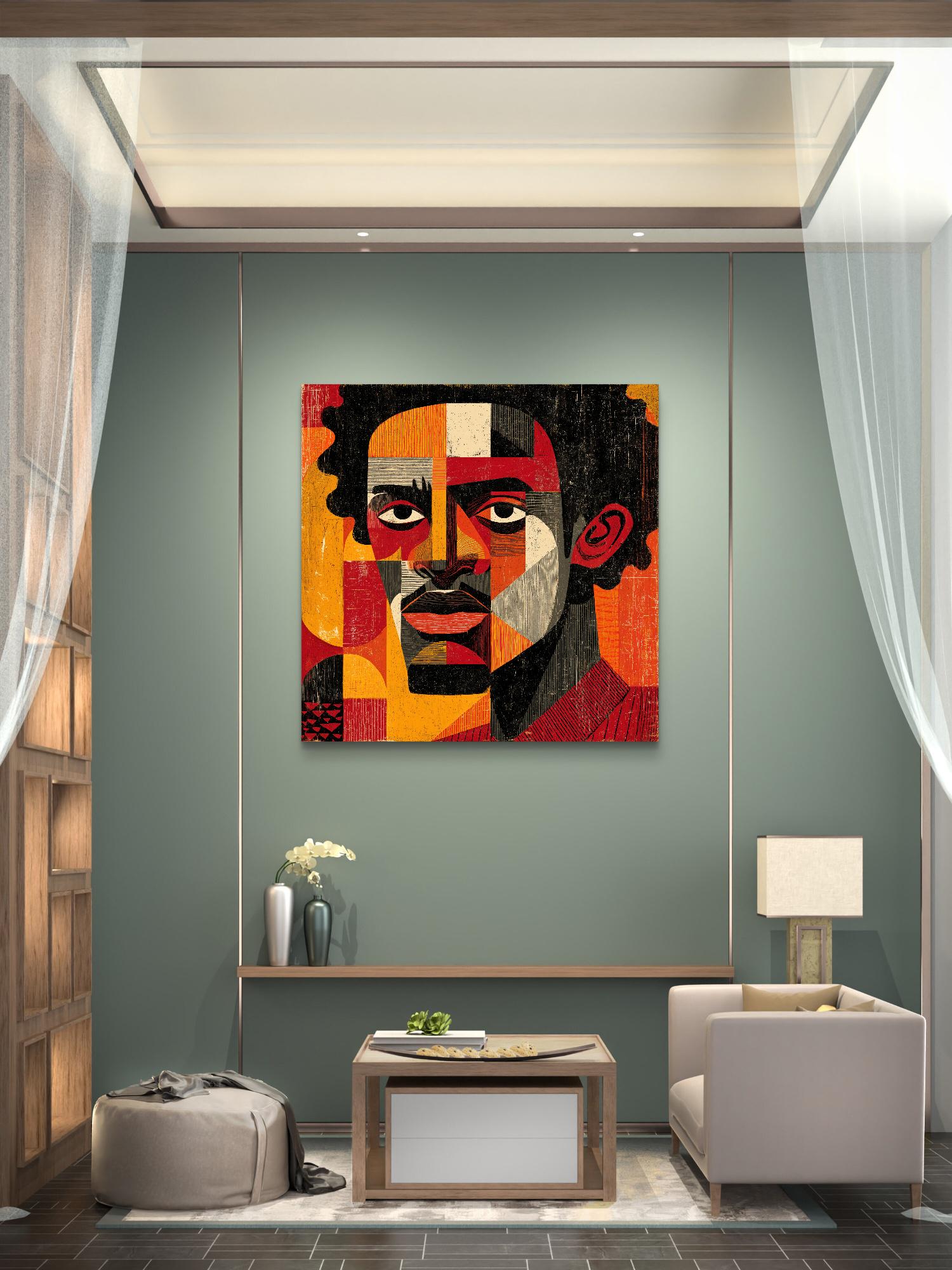 Fractured Gaze reimagines identity through geometry and color. Bold shapes, warm tones, and textured layering create a striking, modern portrait that blurs realism and abstraction. This piece captures strength, introspection, and a fragmented beauty — ideal for expressive interiors, creative spaces, or art lovers drawn to depth and edge.