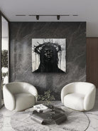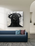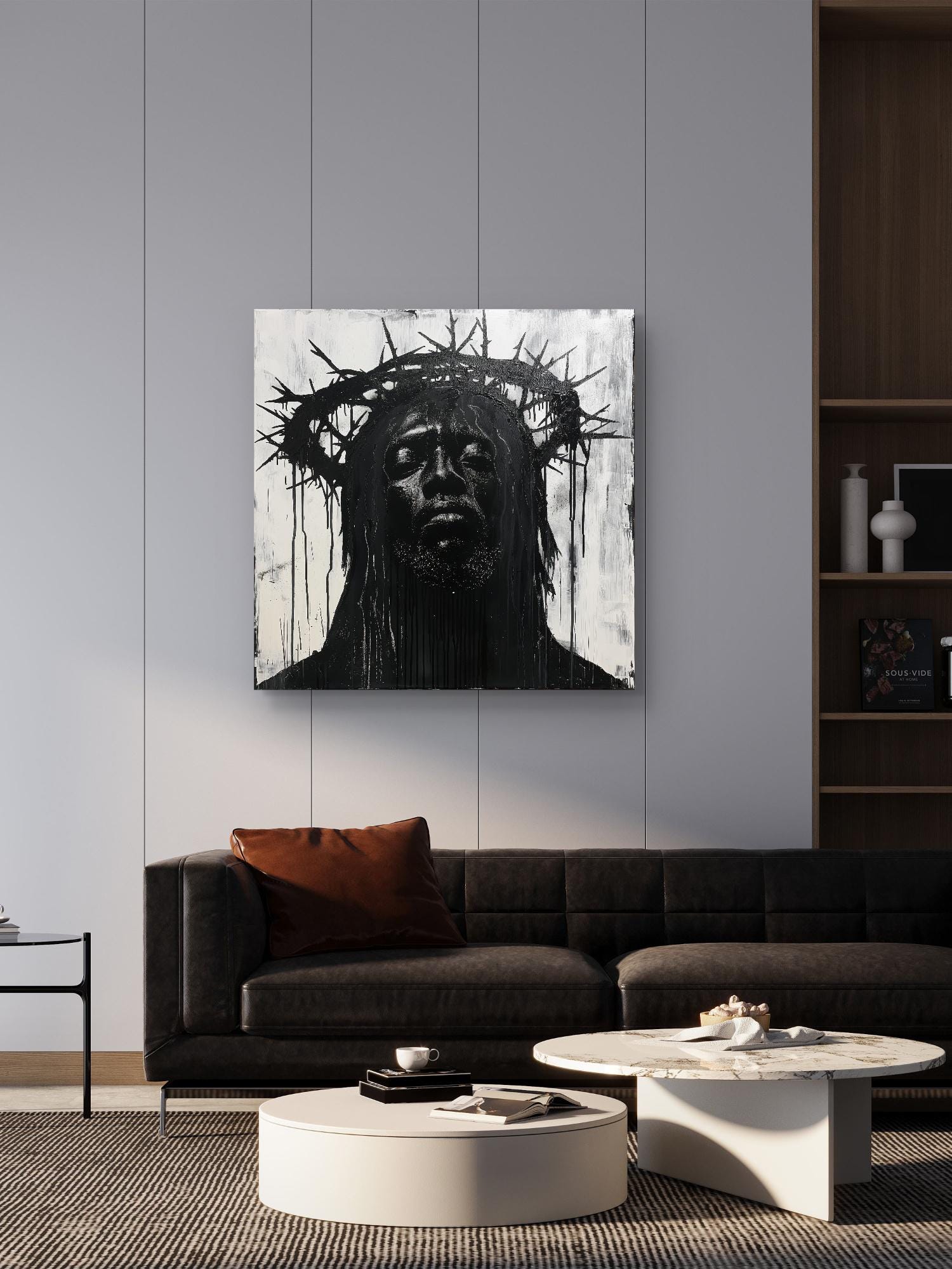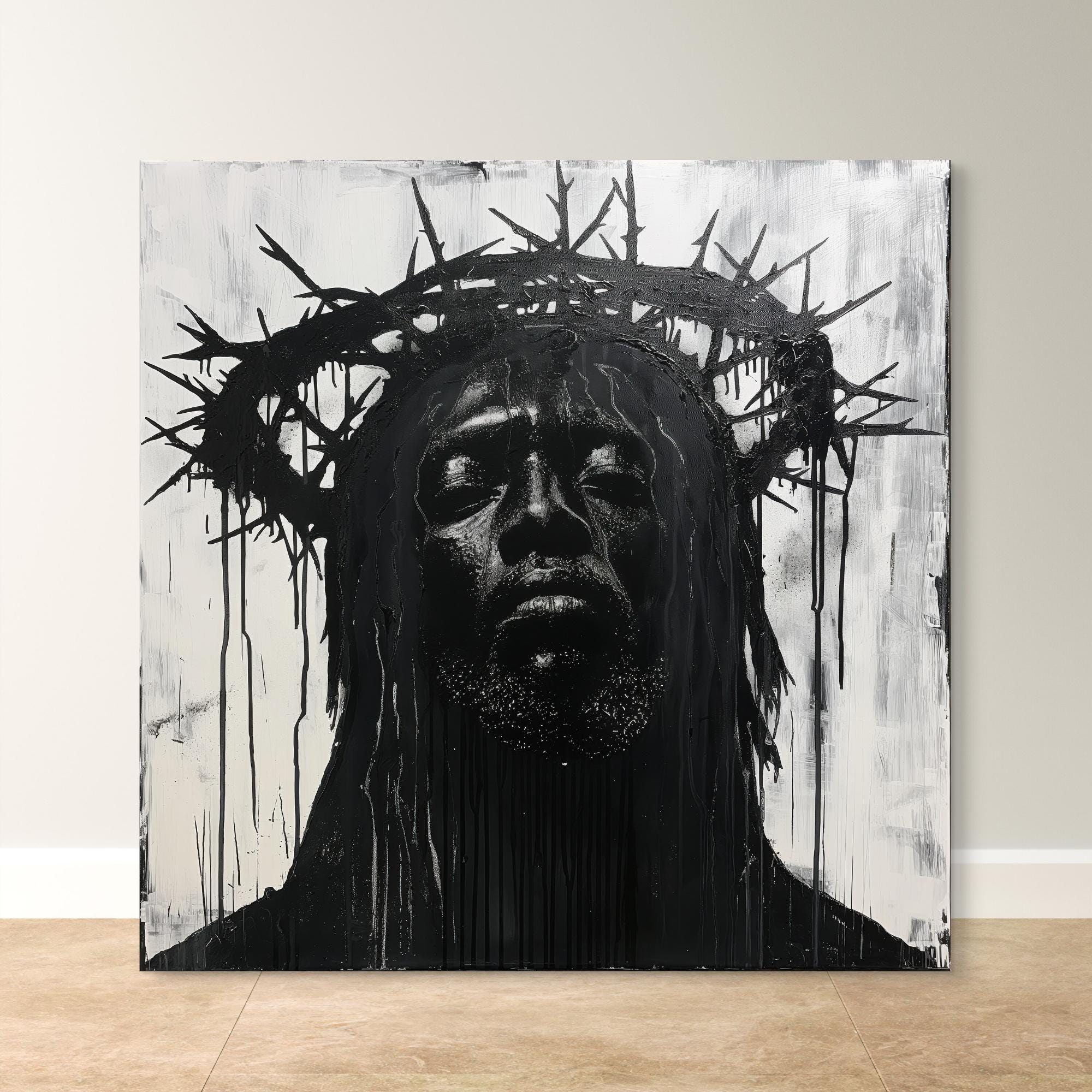 Crown of Thorns - Black Jesus Wall Art portrait that evokes strength, sacrifice, and transcendence. Featuring a deeply expressive figure crowned with thorns, rendered in heavy black brushwork and layered textures, this artwork commands attention and invites reflection. A breathtaking historical digital print that masterfully captures the divine essence of Black Jesus.