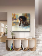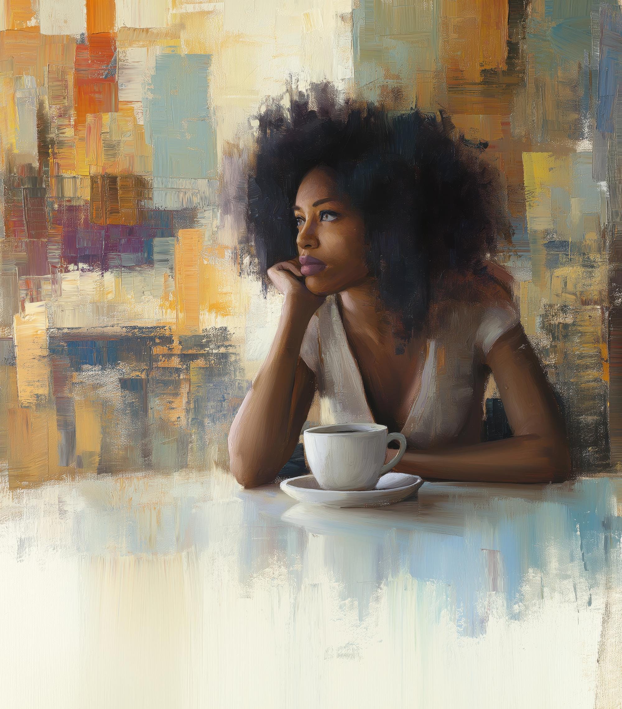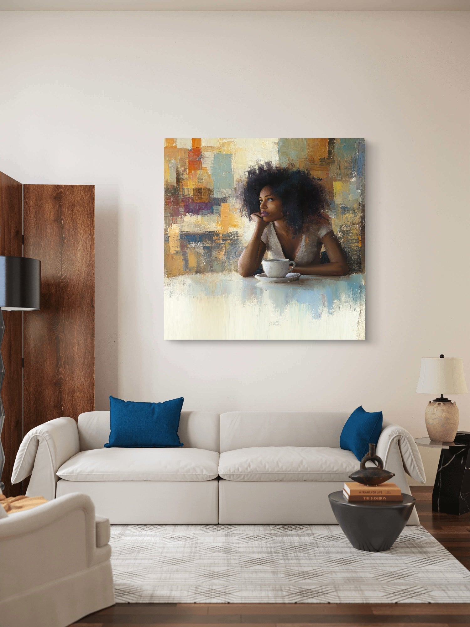 Start your day with the warm and introspective energy of “Morning Reflections.” This stunning artwork captures a Black woman in quiet contemplation, gazing out as she enjoys a warm cup of coffee. The textured brushstrokes, rich earthy tones, and dreamy background create a piece that exudes serenity, depth, and modern elegance. Perfect for coffee lovers, art enthusiasts, and those who cherish quiet moments.