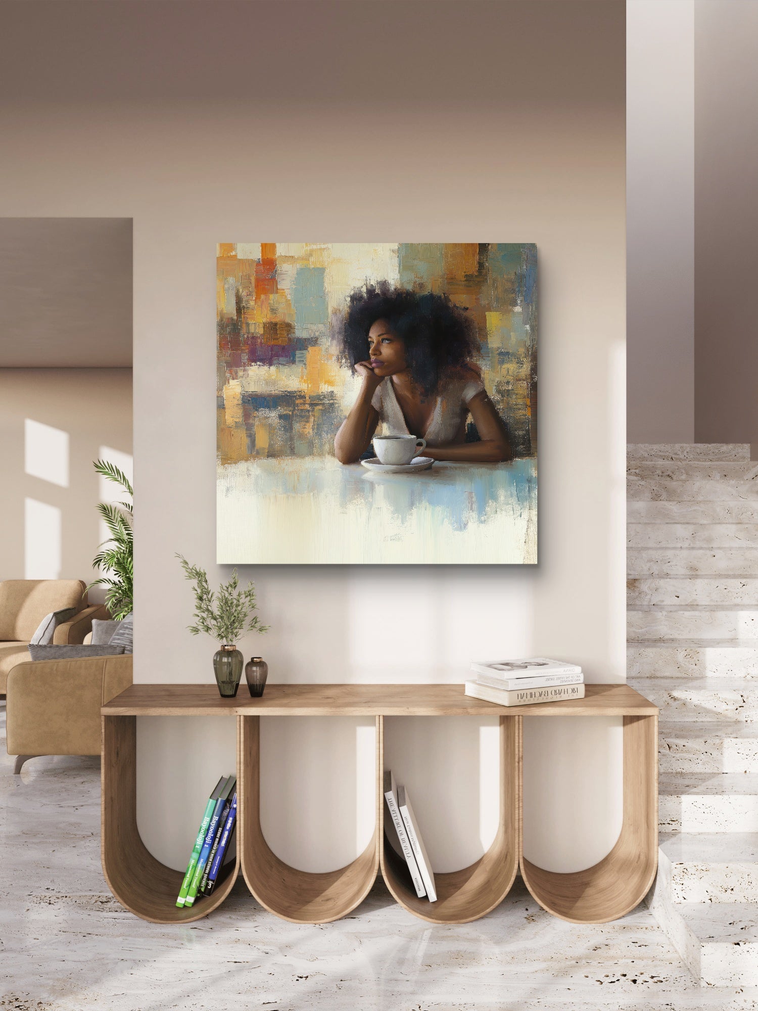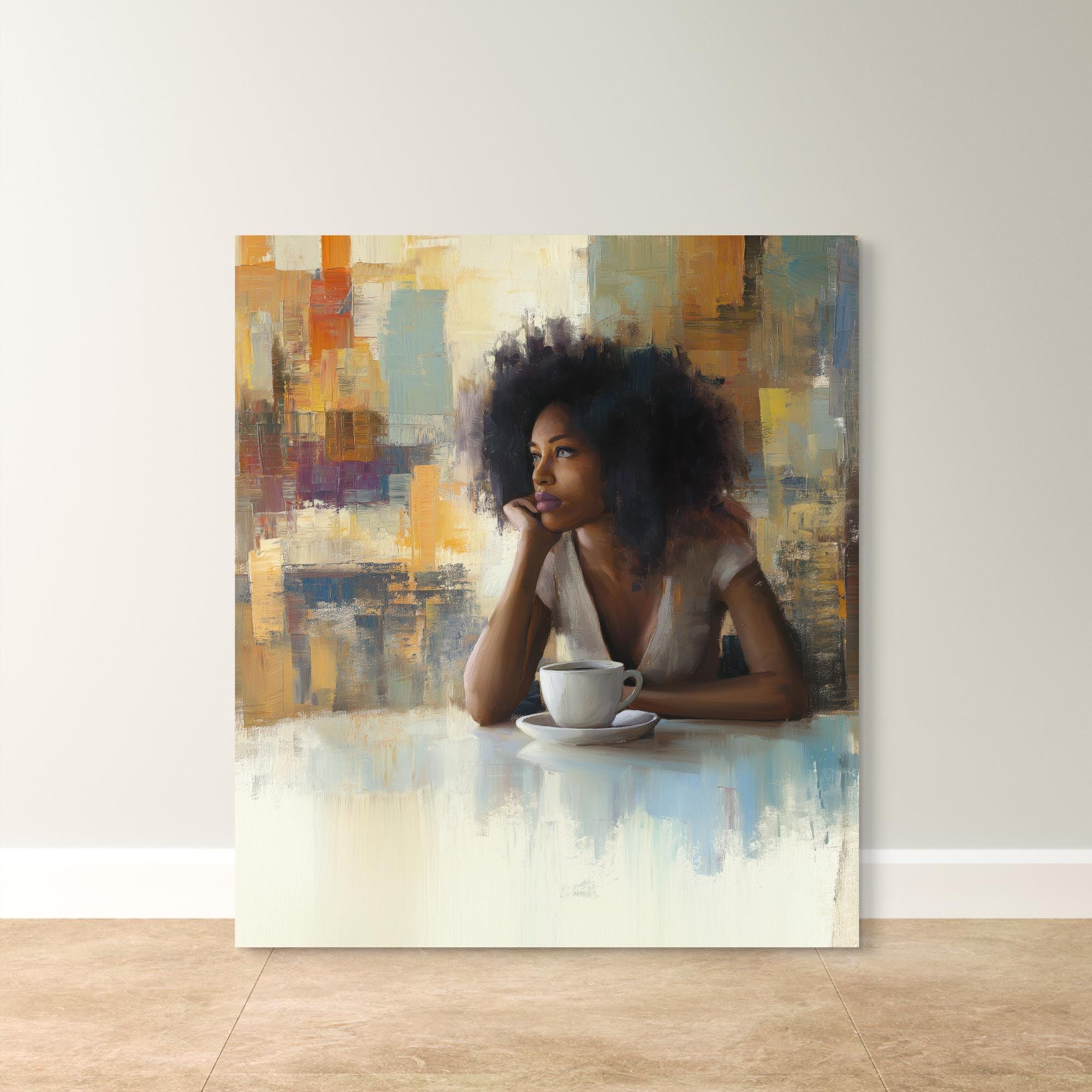Ideal for kitchens, cafés, living rooms, and reading nooks, this piece adds warmth and personality to any setting. The Afrocentric beauty and cozy café vibe make it a stunning statement for coffee lovers and art collectors alike.